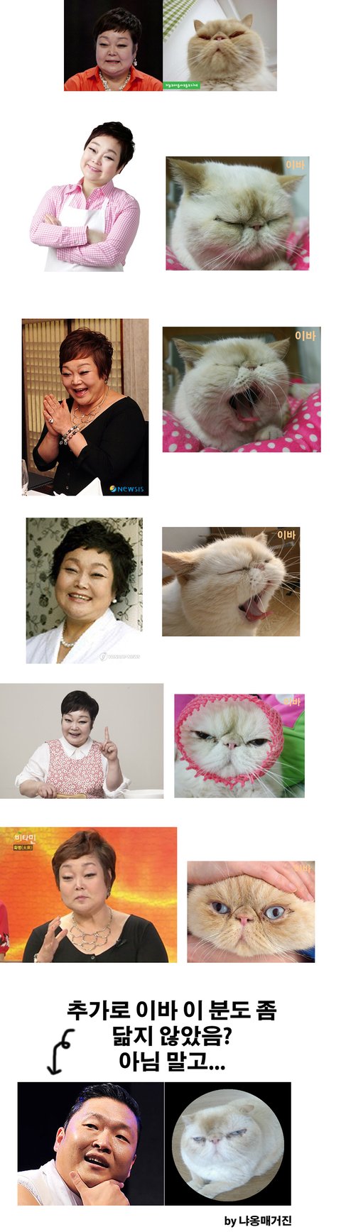 이 곳 동사방에 사진올리고 많은 분들이 우리 이바가 요리연구가 이혜정님 닮았다고 하셔서 진짠가 검색해 보았습니다. 순간 경악~ 인정하지 않을 수가 없네요. 영광으로 여기고 기념샷을 몇 장 모아봤습니다.재미삼아 구경하셔용.이혜정님이 혹시라도 발견하시고 화내지 않으셨으면 합니다.