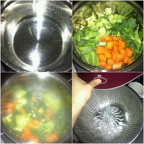 2) 그런 다음 정수기에서 찬물을 그릇에 담고 아까 준비한 채소를 넣고 10분간 끓임