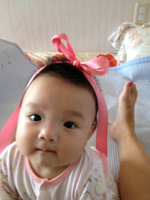 핑크 리본으로 머리띠를 만들어주었네요~ 나중에 크면 머리띠 사줄께 ㅜㅜ 일단 머리가 길어야겠구낭~