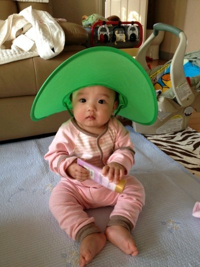 머리 감을때 하도 징징 대서 샤워모자를 사서 씌우고 한답니다.