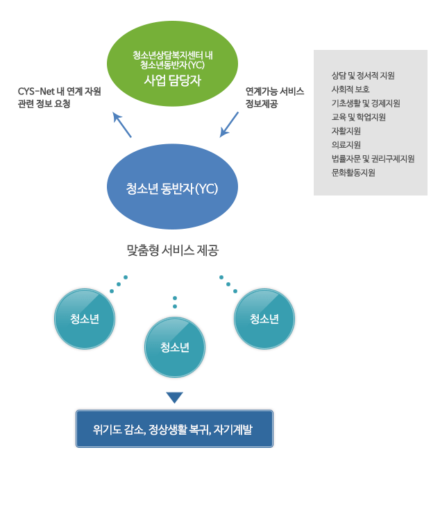 -청소년에게 정서적 후원과 환경 변화를 통해 문제해결을 지원합니다.