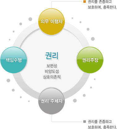 기억해야 할 것은, 권리주체자는 자신의 권리를 주장할 뿐 아니라 타인의 권리를 존중할 책임이 있는 의무이행자이기도 하다는 것입니다.