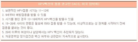 ACOG(미국 부인암협회) 권고안에 따르면 성생활을 하고 있는 경우에도 HPV백신을 접종 받을 수 있고, 과거에 비정상세포진 검사 결과가 나왔거나 성기 사마귀가 있던 여성들도 접종대상이 될 수 있습니다.
