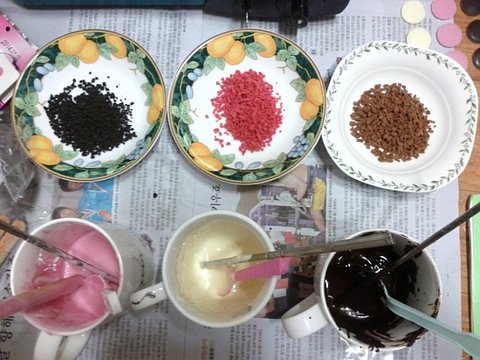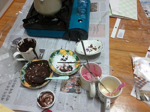 먼저 초콜릿들을 물에 중탕시켜서 녹여 놓고 과자가루(?)들을 풀어 놓습니다