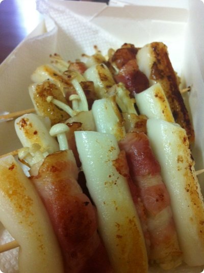 팽이버섯을 베이컨으로 말아준뒤에 떡하나 베이컨하나 해서 꽂아서 팬에 구으면 끝~ 뒤쪽에 약간 탄 것처럼 나온건 데리야끼소스에 다진마늘 섞어서 바른 후에 구워서 그래요~^^ 짭쪼름하니 맥주안주로도 넘 좋은 꼬치랍니당~^^