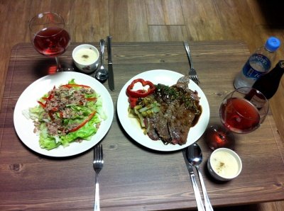 할머니 모시고 일년에 한두번 축제를 보러 다니는데 올해는 한 번 밖에 못다녀왔어요ㅠ 횡성한우축제 갔다가 한우 사서 제 자취방에서 차려본 소박한 저녁식사~ㅎㅎ 요렇게 차리긴 했는데ㅋㅋ할머니는 밥과 김치가 있어야 되시는 분이라 준비해드렸답니당.ㅎ 그리고 와인도 제가 다마시고 할머니는 백세주~ㅋ그래도 스프를 두 그릇이나 드시고 발사믹 소스 샐러드랑 스테이크도 완전 많이 드셨다는ㅎ 스테이크는 채끝으로 했어요~^^ 스테이크 구울 때 야채를 먼저 살짝 익히는데 바나나 하나 슬라이스쳐서 넣으면 달콤하니 맛나용^^