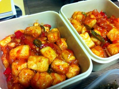 그리고 녹말가루 입혀서 튀켜낸 두부에 양파랑 파프리카 청양고추 다져서 넣고 칠리소스랑 고추가루 살짝 넣어서 볶아낸 칠리두부~ 맛이쪄! 매콤해용^^