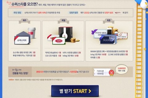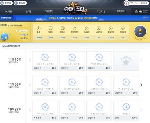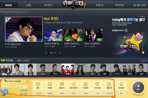 티빙 슈스케 전용관에서 저기 보이는 '슈퍼스타'를 모아서 상위 10% 이내가 되면 매주 추첨을 통해 슈퍼스타k4 생방송 방청권을 받을 수 있습니다.