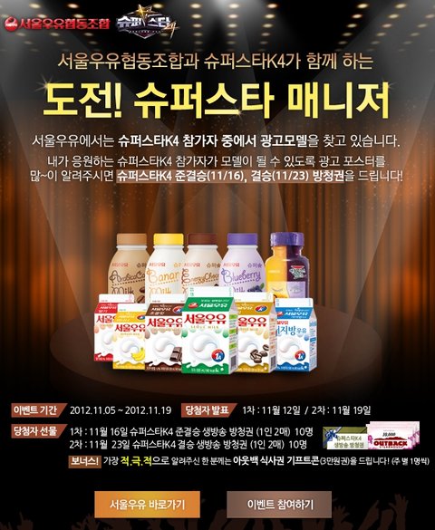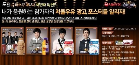 이름하여 '도전! 슈퍼스타 매니저!'서울우유 제품들과 닮은 슈퍼스타k4 참가자의 서울우유 광고 포스터를 스크랩하는 것입니다.