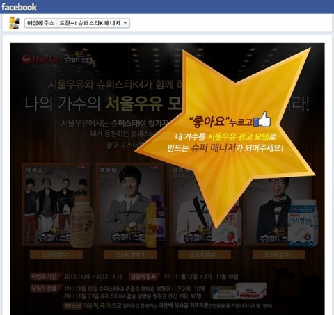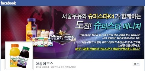 서울우유 아침에주스 페이스북에서 '도전! 슈퍼스타k4 매니저' 앱 좋아요를 누르면 참여하실 수 있습니다.