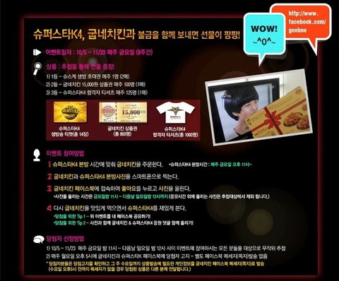 추첨을 통해 1차: 11월 16일 슈퍼스타k4 준결승 생방송 방청권 (1인 2매) 10명2차: 11월 23일 슈퍼스타k4 결승 생방송 방청권 (1인 2매) 10명을 드립니다.
