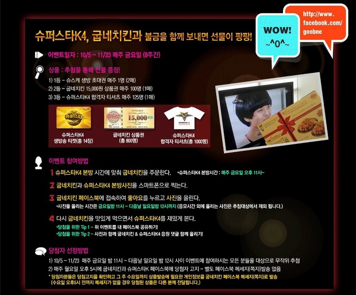 1. 슈퍼스타k4 본방 시간에 맞춰 굽네치킨을 주문한다 2. 굽네치킨과 슈퍼스타K4 본방사진을 스마트폰으로 찍는다 3. 굽네치킨 페이스북에 접속하여 좋아요를 누르고 사진을 올린다 당첨TIP !! 위 이벤트를 공유하고, 사진과 함께 응원 댓글을 올리면 당첨 확률 UPUP !!!!