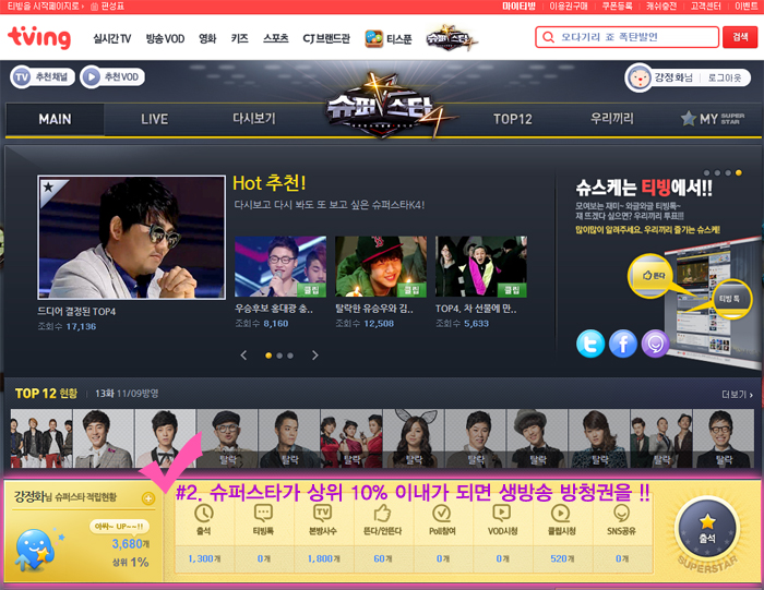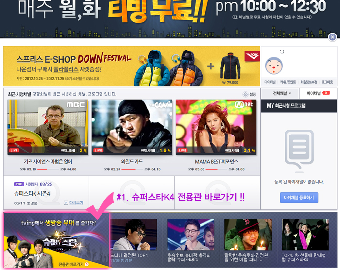 우선 티빙 홈페이지에 접속 후, 아래에 있는 슈퍼스타K4의 전용관을 클릭클릭 !!