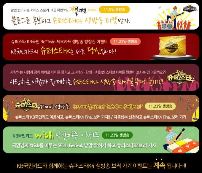 슈퍼스타K4의 메인스폰서죠 ! KB국민카드 ! 메인스폰서 답게, KB국민카드에서는 가장 많은 이벤트가 진행중에 있는데요 :-)