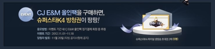 티빙에서 진행하는 또 다른 슈스케4 이벤트! 얼마 전에 티빙에서 CJ E&M 모든 방송을 실시간, 다시보기 할 수 있는 CJ E&M 올인팩을 출시했는데요, 올인팩 출시 기념 이벤트로 CJ E&M 올인팩을 구매하면 슈퍼스타K4 파이널 생방송 초대권 2매를 다섯 분께 드린다고합니다 :->