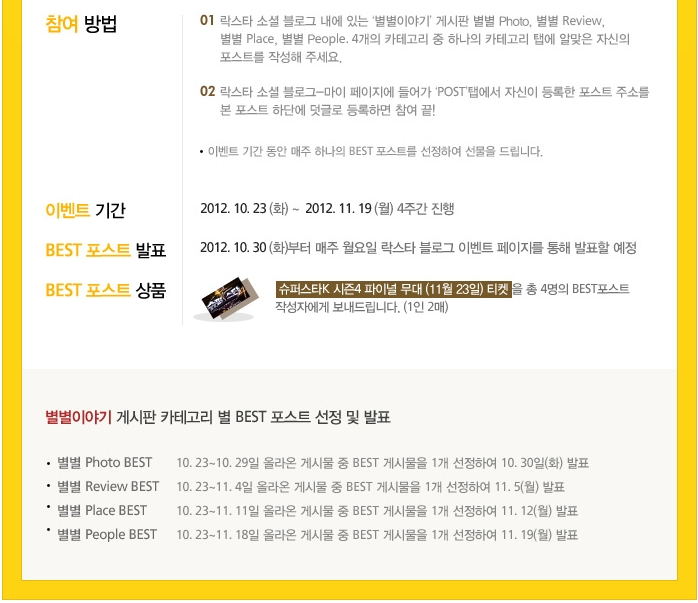 락스타 소셜 블로그 내에 있는 '별별이야기' 게시판 별별 포토, 별별 리뷰, 별별 플레이스, 별별 피플 4개의 카테고리 중 하나의 카테고리 탭에 알맞은 자신의 포스트를 작성하면 됩니다 :-) 추첨을 통해 총 4명의 베스트 포스트 작성자에게 슈퍼스타k4 결승전 방청권을 준다고 해요~~