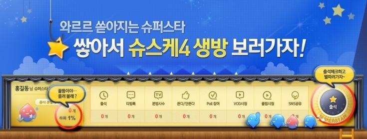 상위 10%가 되시기만 한다면, 매주 추첨을 통하여 슈스케4 생방송 티켓을 받으실 수 있다고 함나도 해봤는데 의외로 금방 올리더라구????그리고 짧게짧게 무대 영상도 공짜로 감상할 수 있어서 좋았음