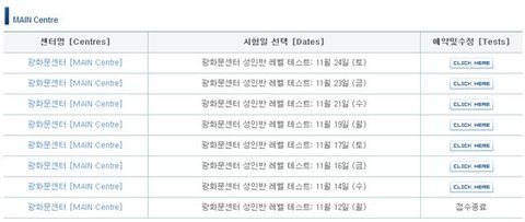 예를 들어 영국 문화원 어학원 광화문 센터에서 레벨 테스트를 받으시려면 ‘센터명 : 광화문 센터’로 바꾸시고 시험일은 본인이 편한 시간을 선택한 뒤 ‘CLICK HERE’ 버튼을 누르세요!