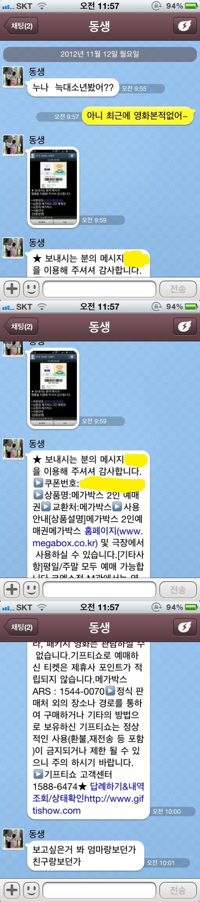 한동안 대화를 안했는데 아래 톡을 보내옴. 나보고 영화 보러 가라며... ![]()