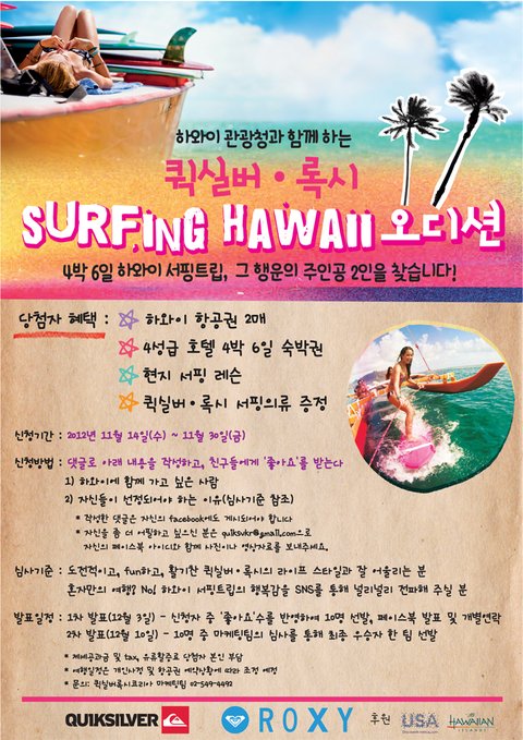 퀵실버록시코리아에서 ‘하와이서핑오디션’이벤트를 진행 하니 참여해보세요!