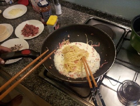 4. 프라이팬에 요염하게 면을 담그시기전에 면에다 버러ㄹ을 발라줍시다. 면을 넣으신 후에는 다른재료들과 함께 볶아주세요. 약 2분뒤에는 프라이팬에 크림소스를 사뿐히 따라주시와요. 입맛따라 후추랑 소금도 팍팍 뿌려주시길.