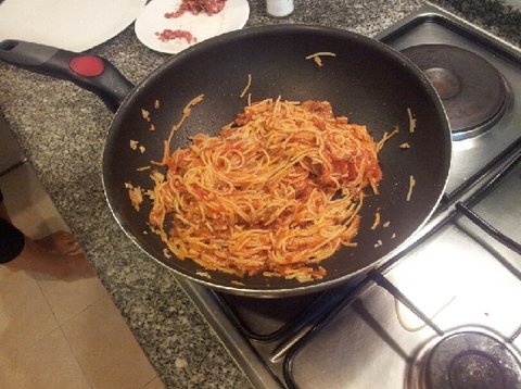 8. 아까처럼 면이랑 다른재료들이랑 볶는데 이번에는!! 크림소스가 아닌 토마토소르를 뿌려주세요!