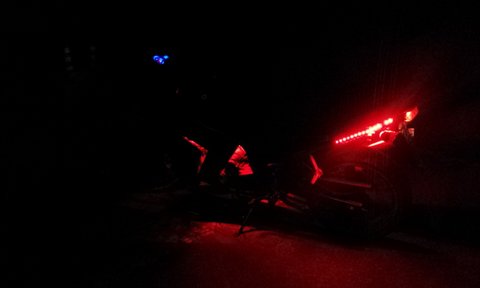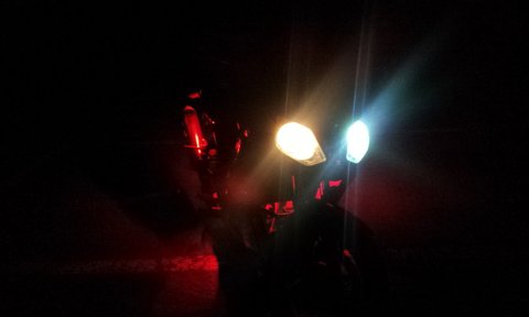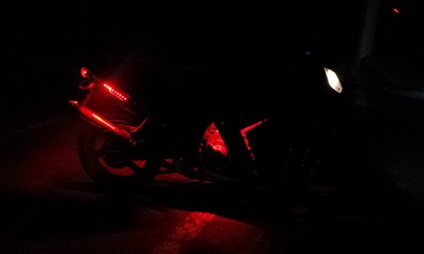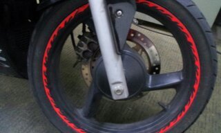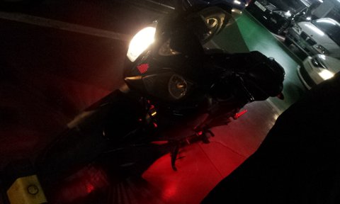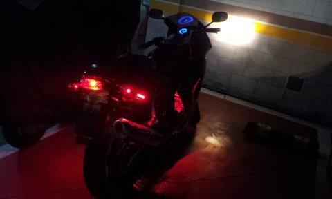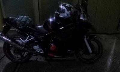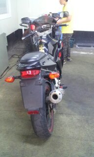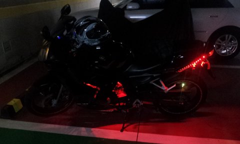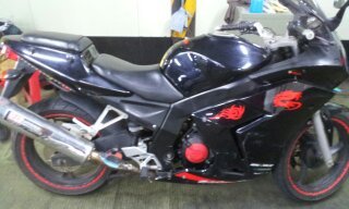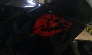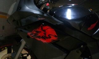 오토바이 특징은 마후라에 요시무라 스티커 부착되어 있구요. 사진에서 보시다 시피 검은색에 빨간색 led와 스티커가 부착되어있습니다. 도난시 부착되어있는 스티커가 늑대스티커구요 기름탱크엔 날개 스티커 부착되어있습니다.