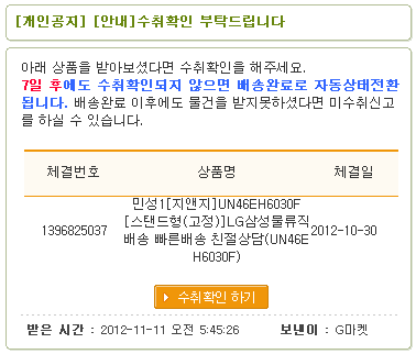 만약 7일동안 쪽지를 확인 못하면 그냥 배송완료 처리되어 업체로 돈이 입금됩니다.
