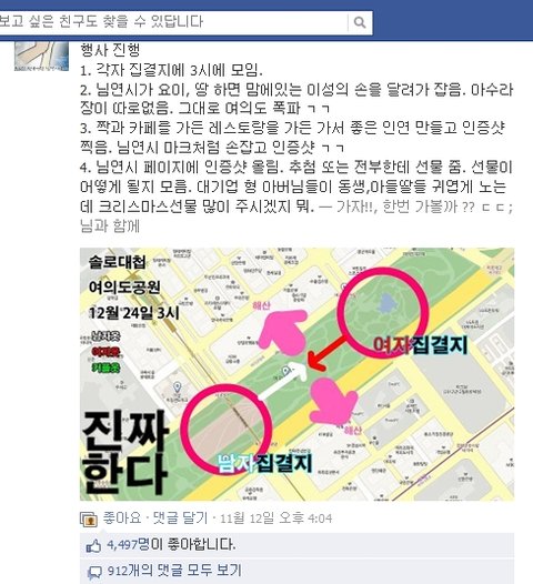 여의도 공원에서 12월 24일 오후 3시 정말로! 솔로대첩 펼쳐지는 광경