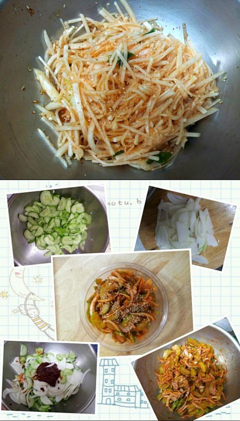 위에껀 제입맛에 맞게 덜맵게 만든 무채고요 아래껀 신랑입맞에 맞춰 맵게 만든 오이무침이예요^^