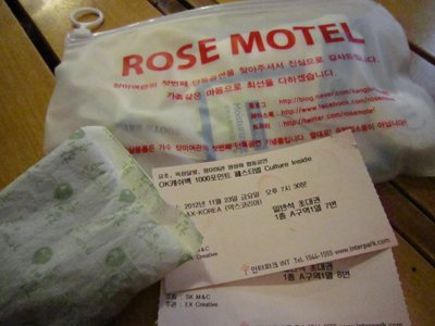 Rose Motel 이라고 적힌 파우치에 1회용 목욕용품들이 들어있어요~