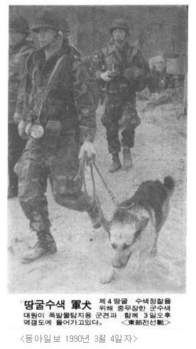 적이 파 놓은 땅굴을 소탕하기 위하여 군견을 앞세운 수색팀은