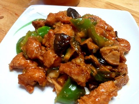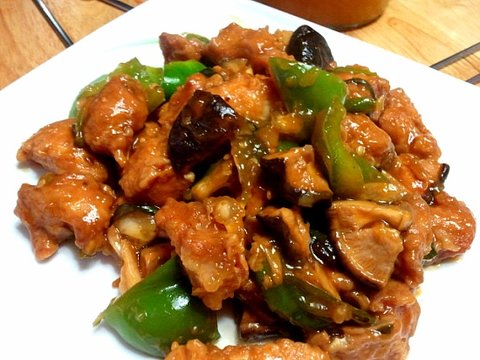 위에 조리된 것과 피망 죽순 표고버섯 마늘슬라이스를 고추기름에 볶으시다가 닭육수 넣고 끓이신다음에