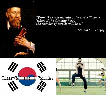 최근 노스트라다무스가 싸이의 출현을 예언했으며 이것은 지구 종말과 연결된다는 주장이 해외 누리꾼들 사이에서 화제가 되고 있다.