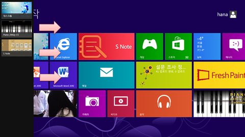 오른쪽의 가장자리에서 왼쪽으로 화면을 쓸어주면 윈도우8의 또다른 야심작인