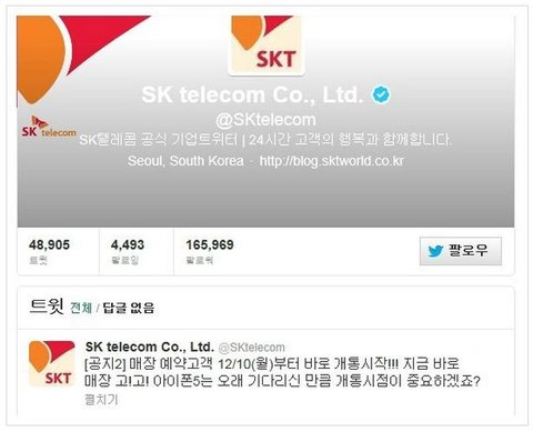 온라인의 경우 예약신청 후 차수가 밀리면 언제 받을지 기약할 수 없지만 SKT 대리점 예약신청의 경우 12월 10일부터 아이폰5 즉시개통이 시작된다고 하네요^^그래서 친구한테 오늘예약하면 언제쯤 아이폰5를 받을 수 있냐고 물어봤더니.....10일날 바로 받을 수 있다고 하면서 SKT 트위터를 확인해 보라고 하는거예요 ㅋㅋ