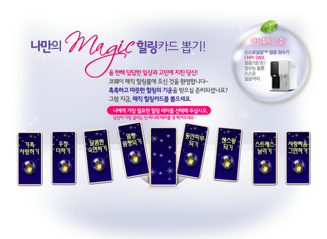여러분~ 코웨이가 선사해드리는 촉촉하고 따뜻한 힐링의 기운을 받으실 준비가 되셨나요? 나만의 매직 힐링카드를 뽑으시는 방법은 너무나도 간단해요 ^-^