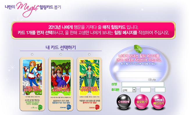 그리고 3장의 카드 중 원하는 힐링 문구가 적힌 카드를 고른 후 ‘나에게 보내는 힐링메세지’를 작성하면 응모완료~!! 2013년 행운의 기운이 가득 담긴 ‘여러분만의 매직힐링 카드’를 여러분의 핸드폰으로도 전달받으실 수 있습니다.
