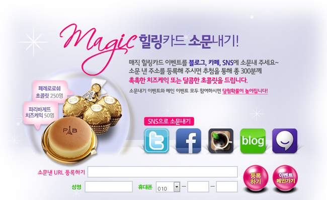 2. 매직 힐링카드 이벤트 소문내기 : 페레레로쉐 초콜렛(250명), 파리바게뜨 치즈케익(50명)