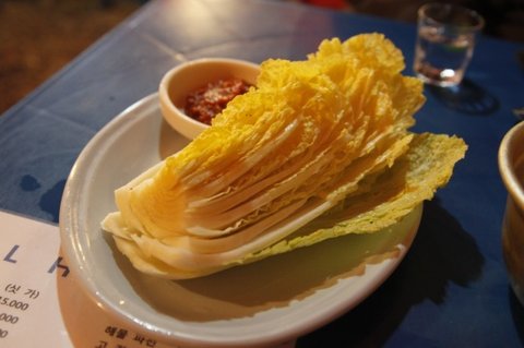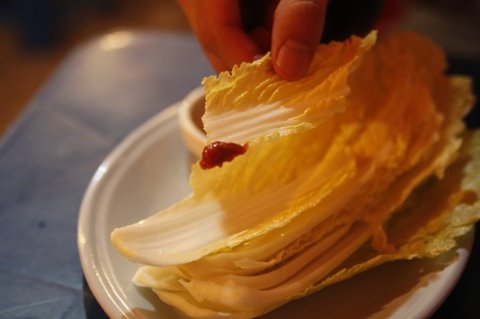 아삭아삭 고초한 배추를 된장에 찍어 먹습니다.