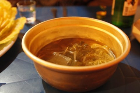 꼼장어와 소주를 시키자 냉이배추된장국이 나와요