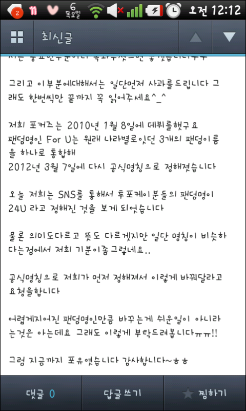 어제 저희는 그룹 24K 분들의 팬덤명이 24U(투포유)라고 정해졌다는 소식을 듣게 되었습니다