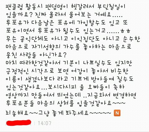 저희는 전에 가입했던 적도 없고 당연히 팬덤명 투표 과정에 투포유가 있었다는 것도 몰랐으며