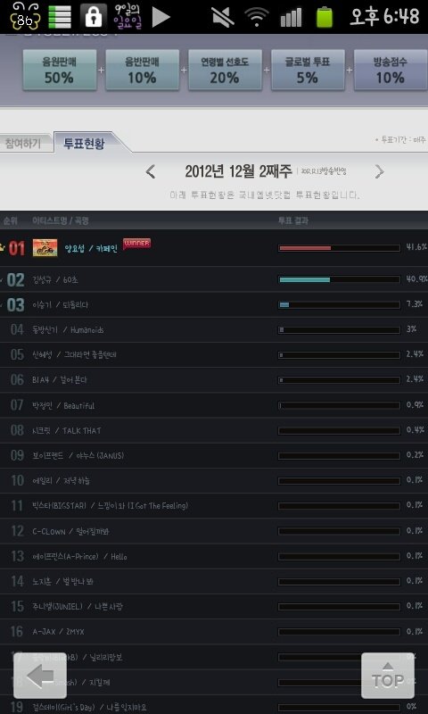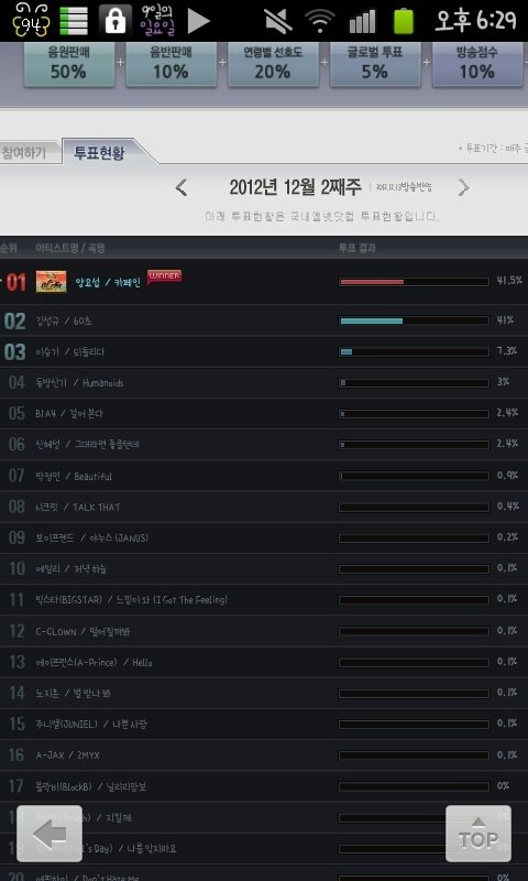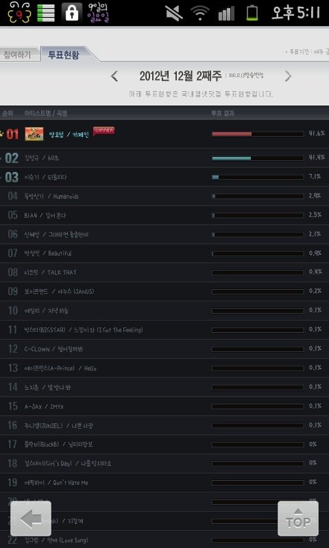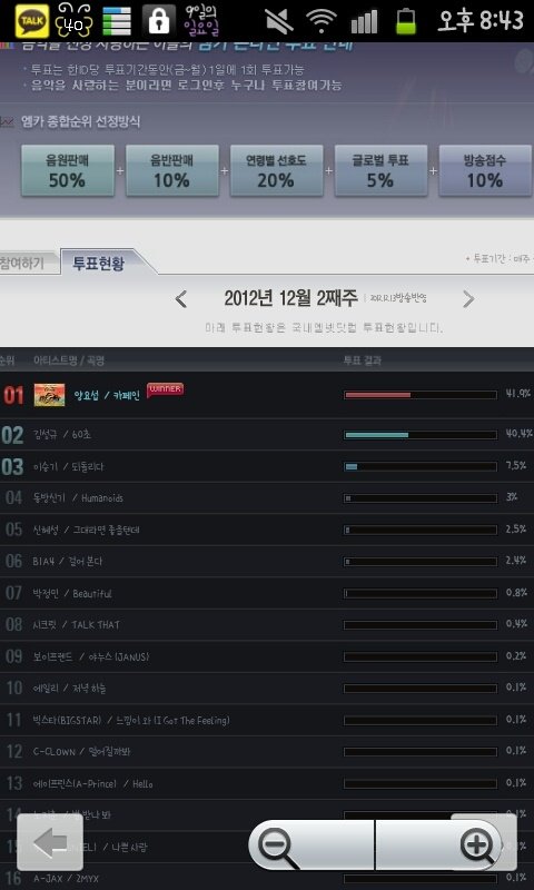 김성규 43.4% , 양요섭 43.2%로 0.2% 차이로 김성규가 1위였습니다.