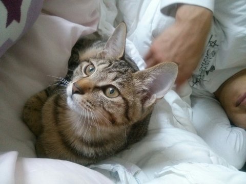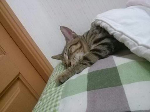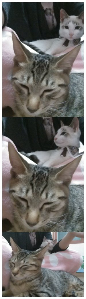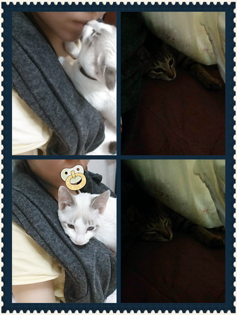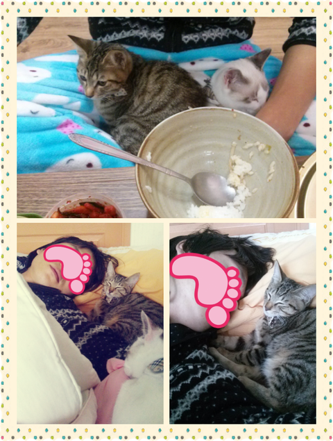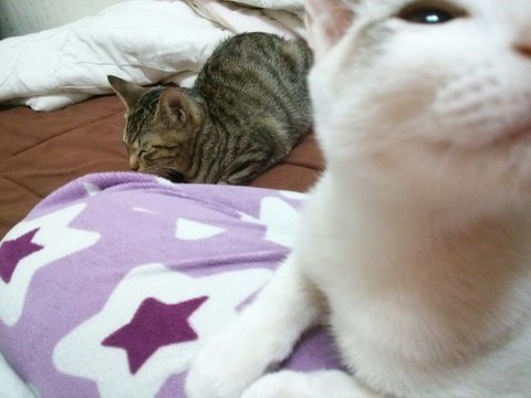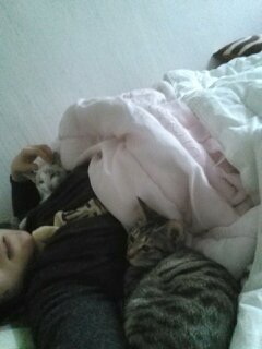 냥이들을 사이에 끼고 핡핡핡!!! 같이 잘 줄이야!!!!![]()