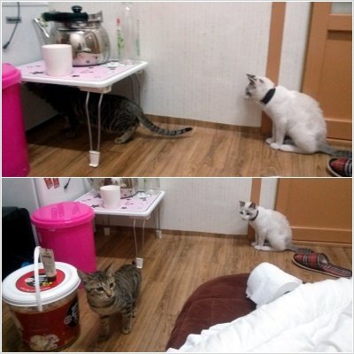비비가 하악질을 해대니 마늘이는 저렇게 멀찌감찌 떨어져서 보고있더라구요 ㅋㅋㅋㅋㅋㅋㅋㅋ