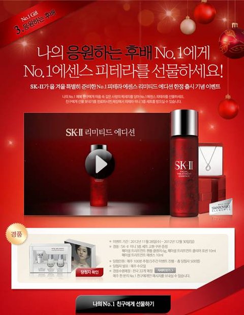 나의 응원하는 후배 No.1에게 No.1 에센스 피테라를 선물하는 이벤트더라고요. 이 이벤트는 11월 28일부터 12월 30일까지총 5주간 매주 100명을 추첨해 SK-II 미니 3종 세트 교환 쿠폰을 증정한다고 해요.