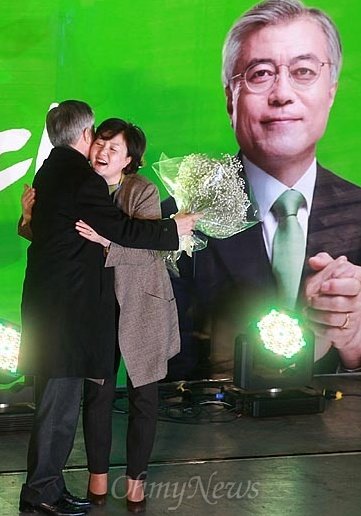 ▲ 문재인 민주통합당 대선후보 부인 김정숙씨가 11월 27일 오후 서울 세종문화회관앞에서 열린 집중유세에서 연애시절 추억이 담긴 안개꽃을 문 후보에게 선물한 뒤 포옹하고 있다