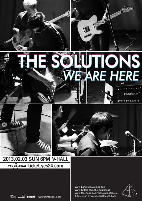 그리고 오는 2월 3일, THE SOLUTIONS concert 'WE ARE HERE'를 통해 새로운 출사표를 알립니다. 두 번째 싱글 'Talk, Dance, Party for Love'의 첫 가사이기도 한 'WE ARE HERE'는 지금까지 만들어온 결과물에 대한 자신감의 표현이자, 한 단계 발돋움하고자 하는 의지가 담겨있는 말입니다. 그 동안 멤버 두 사람이 만들어낸 시너지로 제한되어 있었다면, 이번 공연에서는 음악적 동료인 권오경(베스), 박한솔(드럼/홀로그램 필름)과의 완벽한 호흡을 통해 한층 성숙한 밴드로서의 면모를 선보일 예정입니다. 보다 강한 자신감으로 중무장한 이들이 들려줄 긴장 넘치는 사운드의 향연으로 여러분을 초대합니다.