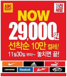 ~2013 1/1 까지 나이키, 아디다스, 컨버스 등 메이커 브랜드 신발 10만켤레 29,000원 균일가 판매. 일부품목을 제외한 전 상품군 신발 최대 50% 할인. 행사기간 내 ABC마트 온/오프라인에서 신발 구매 시 경품 응모 (아이패드 미니 총 100대)